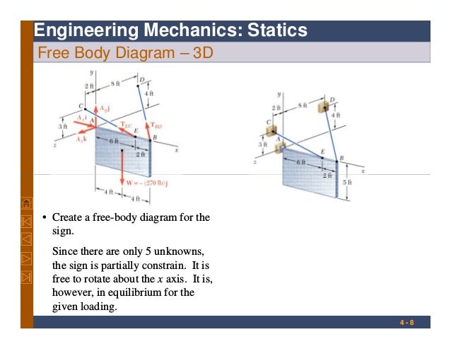 The document Free Body Diagram in 3D Mechanical Engineering Notes | EduRev is a part of the Mechanical Engineering Course Engineering Mechanics . The summations in Eqs. 3/3 include the effects of all forces on the body under consideration. We learned in the previous article that the free-body diagram is the only reliable method for disclosing ...