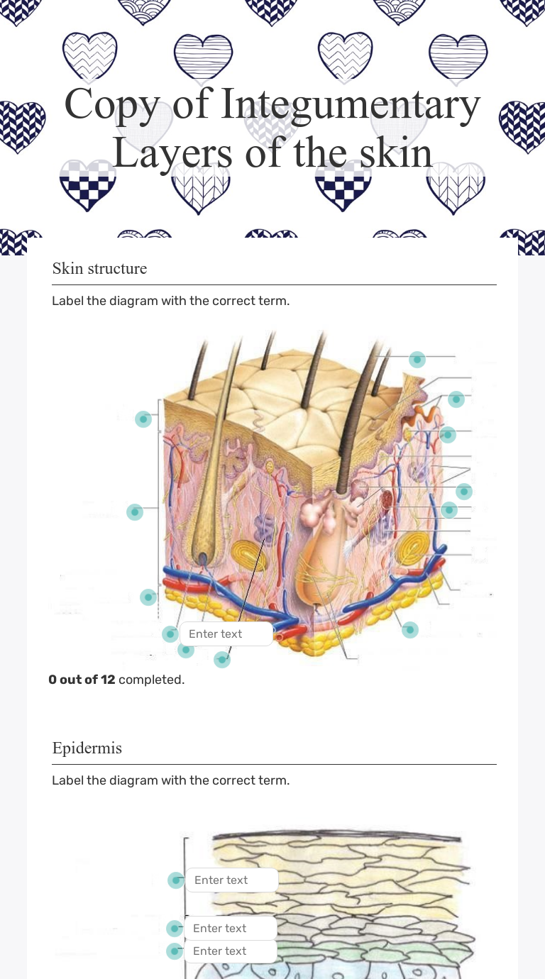 Chapter 6 - Integumentary System. 62 terms. lk058. Sets with similar terms. Parts of the skin. 15 terms. kech6y7f. Chapter 6: The Integumentary System. 60 terms. tiffany_stamp. Anatomy Skin Functions. 19 terms. allyjbills. Layers of the skin. 16 terms. Bclayton2. Other sets by this creator. Anterior view of the Skull. 8 terms. Integumentary system quiz and answers. One of the best ways to start learning about a new system, organ or region is with a labeled diagram showing you all of the main structures found within it. Not only will this introduce you to several new structures together, it will also give you an overview of the relations between them. Activities: Q&A: Skin diagram worksheet Partner Collaboration: Integumentary Stations HW: Complete Section 2 of notes