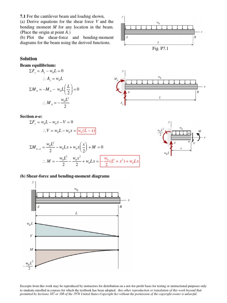 Shear force and bending moment diagram problems and solutions pdf. The two expressions above give the value of the internal shear force and bending moment in the beam, between the distances of the 10 ft. and 20 ft. A useful way to visualize this information is to make Shear Force and Bending Moment Diagrams - which are really the graphs of the shear force and bending moment expressions over the length of the beam. 4.4 Area Method for Drawing Shear- Moment Diagrams Useful relationships between the loading, shear force, and bending moment can be derived from the equilibrium equations. These relationships enable us to plot the shear force diagram directly from the load diagram, and then construct the bending moment diagram from the shear force diagram. Draw a FBD of the beam section showing and labeling all forces and toque acting - including the shear force and bending moment (which act as an external force and torque at the point where we cut the beam.) (See Diagram - Section 1) Notice we have drawn the shear force and bending moment in their positive directions according to the defined ... The shear force diagram is a straight line between the points (0, 13.16) and (5.6, -13.16). The bending moment diagram can be calculated directly but is more easily given by the area under the shear force diagram. Bending moments for distributed loads are quadratic functions (they are the integrals of the shear force function).
