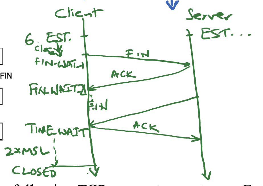 In the TCP state transition diagram, why do we have the TIME-WAIT state and why is its value equal to 2MSL. ... written 3.6 years ago by awari.swati831 ♦ 870: The two reasons for the existence of the TIME-WAIT state and the 2SML timer: If the last ACK segment is lost, the server TCP, which sets a timer for the last FIN (Finish) bit set ... TCP Connection Termination TCP State Transition Diagram Flow Control How does TCP control its sliding window ? Connection Termination Note that after the server receives the FIN_WAIT_1, it may still have messages -- thus, connection not yet closed. TCP State Transitions An Simpler View of the Client Side Simpler Server Model More about ...