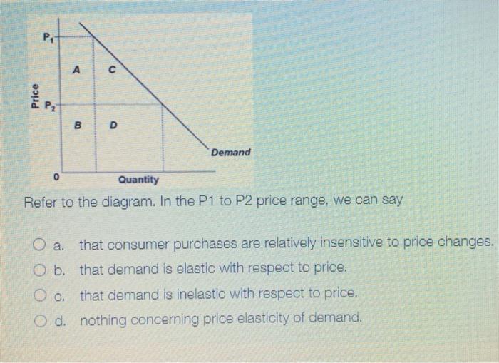 Refer to the diagram. in the p1 to p2 price range, we can say. solved refer to the diagram in the p1 to p2 price answer to refer to the above diagram in the p1 to p2 price range we can say a that consumer purchases are relatively insensiti the graph below grapefruits are on the vertica. READ How to Measure for A Suit Jacket Diagram. 71. Refer to the above diagram. The decline in price from P1 to P2 will: A) increase total revenue by D. C) decrease total revenue by A. B) increase total revenue by B + D. D) increase total revenue by D - A. Answer: D. Type: G Topic: 2 E: 360 MI: 116 72. Refer to the above diagram. In the P1 to P2 price range, we can say: 1 Answer to Refer to the above diagram. In the P 1 to P 2 price range, we can say A. that consumer purchases are relatively insensitive to price changes B. nothing concerning price elasticity of demand. C. that demand is inelastic with respect to price. D. that demand is elastic with respect to price. Whereas the own-price elasticity of demand measures the responsiveness of quantity to a goods own price, cross-price elasticity of demand shows us how quantity demand responds to changes in the price of related goods. Whereas before we could ignore positives and negatives with elasticities, with cross-price, this matters.