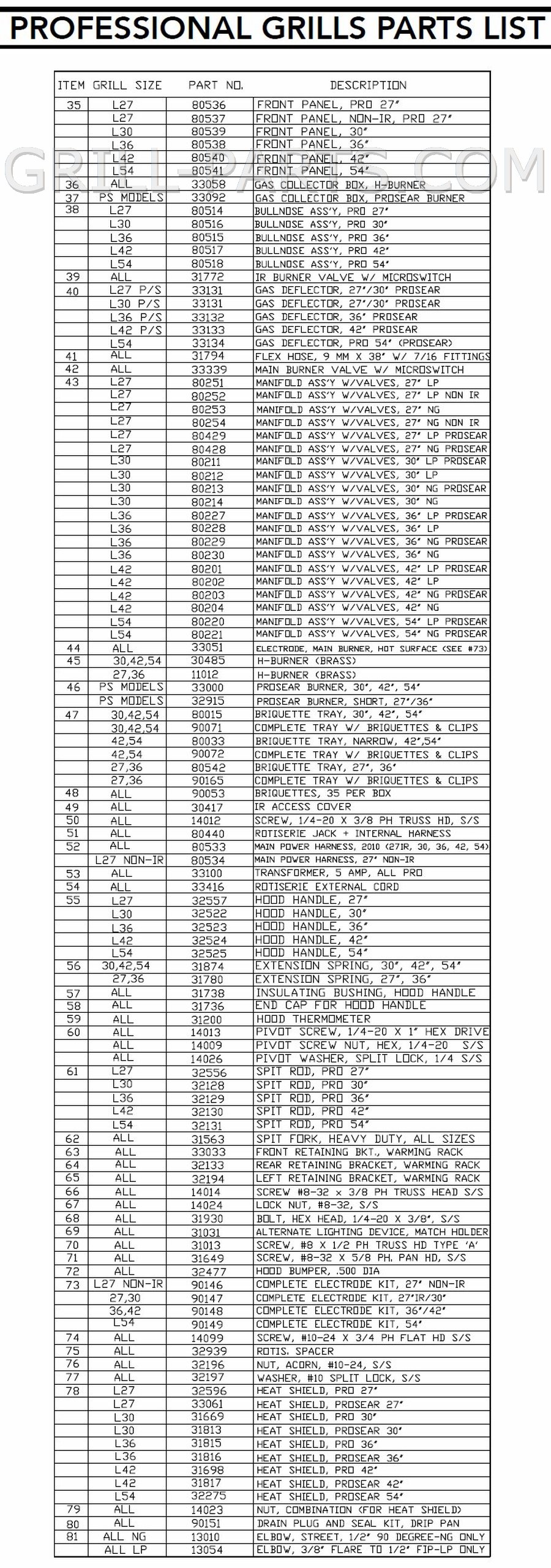 Lynx 54-in Gas Grill Replacement Parts for models : L54, L5430, L5430FR2B, L54FR, L54PS, L54PSFR, L54PSR, L54R, L54SBFR If you do not see the part you need listed, please call us at 877-983-0451. We carry all available service parts.