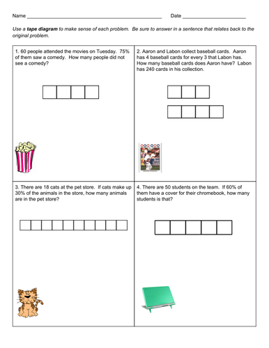 - [Voiceover] What I wanna do in this video is compare the fractions 3/4 and 4/5, and I wanna do this visually. So what I'm gonna do is I'm gonna have two copies of the same whole, so let me just draw that, but I'm gonna divide the first one, so this is one whole right over here, this rectangle, when we draw the whole thing. A tape diagram is another way to represent information in a word problem. We are learning to use tape diagrams to solve problems that involve both multiplication and division. A tape diagram starts with a rectangle. The students must label the tape diagram using information from the problem. Since multiplication and division problems always involve Solve using mental math. Draw a tape diagram and fill in the blanks to show your thinking. The first one was done for you. 20 9 SD b. 11 x I \ twenty-sixes 2.6 twenty-sixes + a. fifties 19 x 50 = twenty-sixes 50 50 50 50 19 Think: Think: 20 fifties— 1 fifties - 50 Lesson 4: COMMON CORE
