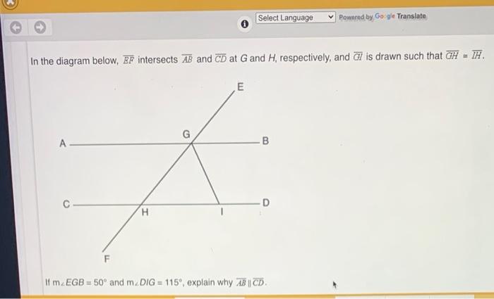 4 answersIn the diagram below; EF Intersects AB and. CD at G and H, respectively: GI Is drawn such that GH #mzEGB 50 and mADIG = 115,explain why AB CD. [4 pts]. Jun 2, 2015 — 32 In the diagram below, EF intersects AB and CD at G and H, respectively, and GI is drawn such that GH :::: IH .25 pages