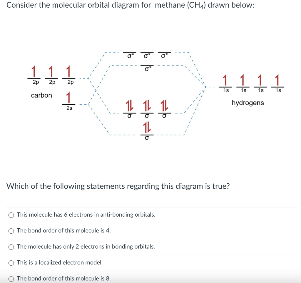 Molecular orbital diagram of ch4 the molecular orbital diagram helps with determining how mixing and overlapping have taken place in a molecule to conclude upon the hybridization type. As per the figure the four sp3 hybrid orbitals of the carbon mixes and overlaps with four 1s atomic orbitals of the hydrogen.