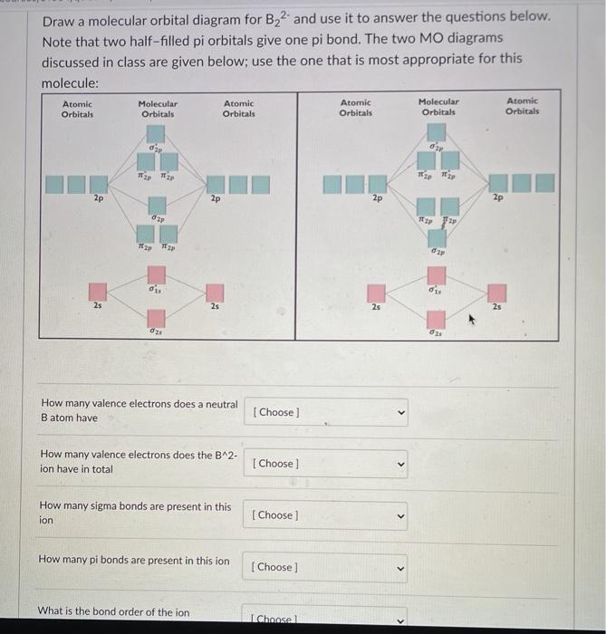 Molecular Orbital Theory allows us to predict the distribution of electrons within a molecule. This allows us to predict properties such as bond order, magnetism, and shape.. There are two types of MO diagrams:. Recall that the bonding MOs are those without an asterisk (e.g., σ 1s), while the antibonding MOs are those with an asterisk (e.g., σ 1s *). The molecular orbital electronic configuration, Magnetic property: Since bond order is zero, Be 2 molecule does not exist. It is diamagnetic due to the absence of any unpaired electron. B 2 molecule: The electronic configuration of B atom (Z = 5) is. B 2 molecule is formed by the overlap of atomic orbitals of both boron atoms. A number of ... When you write the M.O. Diagram for B2, this is what you get: This shows two unpaired electrons in π2px and π2pz. However, the Bond Order of B2 = 1/2 (4-2) = 1. Doesn't this mean that B2 has a single bond between the two Boron atoms--therefore they have one sigma bond? The number of unpaired electrons in the B2+ molecule is 2 (two) 1 (one) 3 (three) zero ; Question: Draw the molecular orbital diagram for B2+ (this is not B-B. it has an electron missing, so its B-B cation!) The number of unpaired electrons in the B2+ molecule is 2 (two) 1 (one) 3 (three) zero