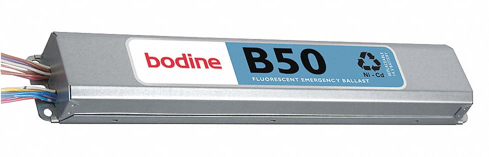 Bodine B50 emergency ballast. This emergency ballast shall consist of a high-temperature, main-tenance-free nickel-cadmium battery, charger and electronic circuitry contained in one 13 3/8" x 2 3/8" x 1 1/2" red metal case. A solid-state charging indicator light to monitor the charger and