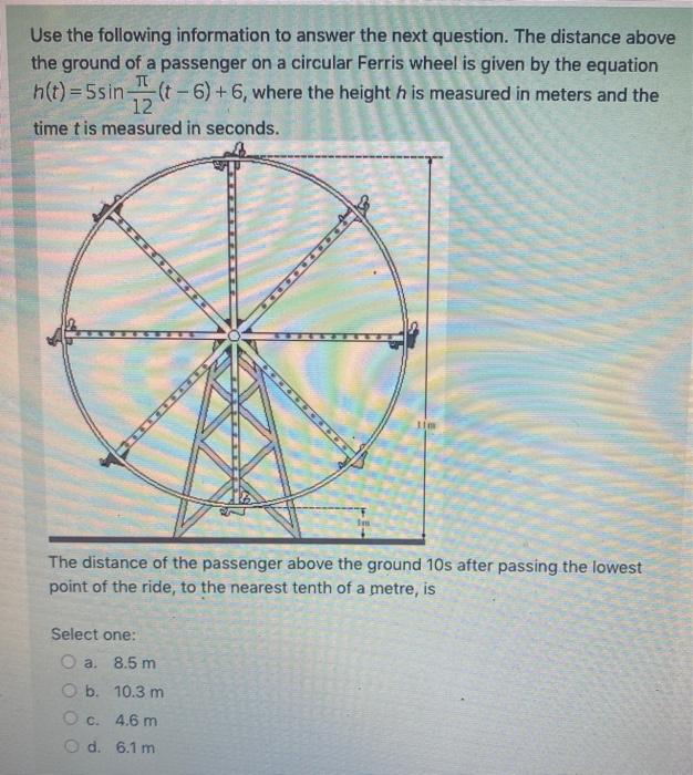 Compute the net change in distance from time t=1 to time t=3 (this is equivalent to s(3)-s(1) b. compute the total Math a ferris wheel with a 40-ft diameter rotates once every 30 seconds. the bottom of the wheel is located 1.5 feet above the ground. you get on at the very bottom of the ferris wheel at time t = 0 and then the ferris wheel begins to