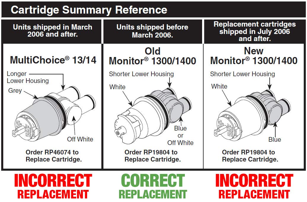 Common Parts - Tub/Shower - Leaks - Delta Faucet Company PART#: RP19804. Cartridge Assembly - 1300 / 1400 Series (04/2006 And Earlier) Current RP19804 cartridge that began shipping in 2015. It can replace any Monitor® series using an RP19804.