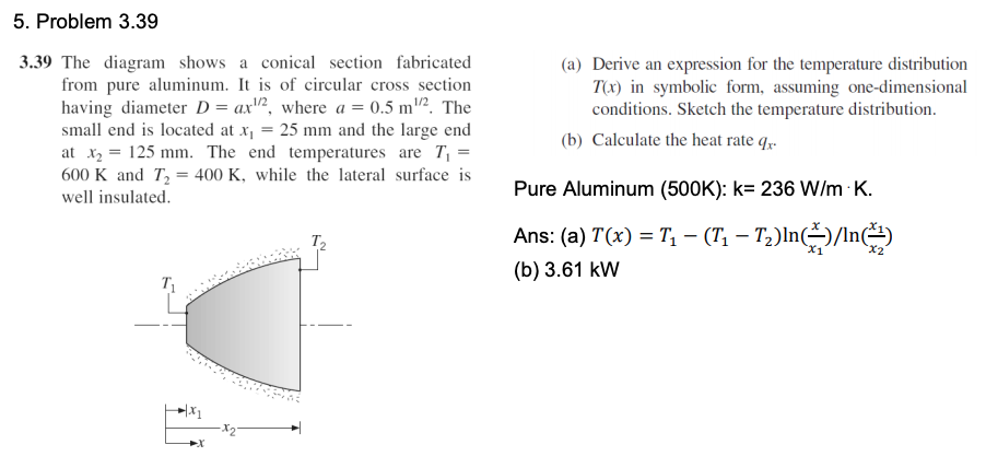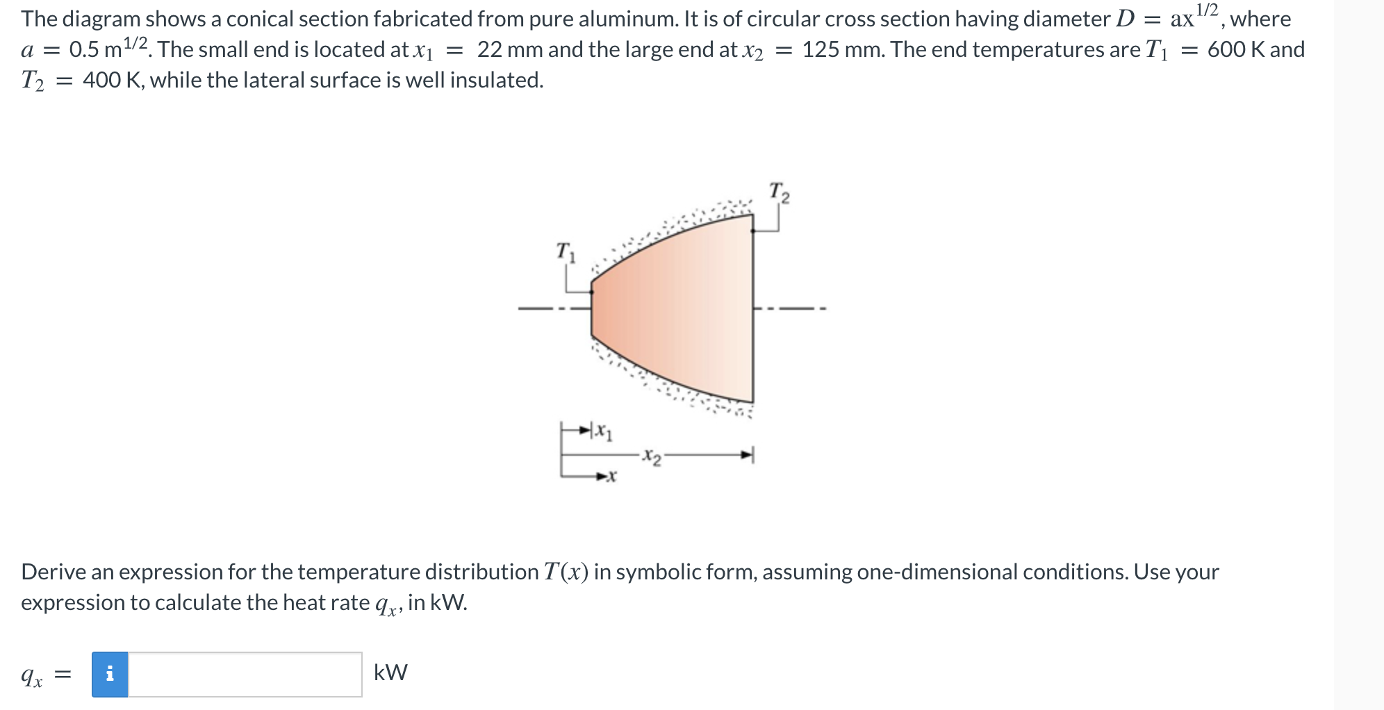 Solved The diagram shows a conical section fabricated from ... The diagram shows a conical section fabricated from pure aluminum. It is of circular cross section having diameter D = a ∙ 𝑥 1⁄2 , where a = 0.5 m1/2. The small end is located at x1 = 25 mm and the large end at x2 = 125 mm. The end temperatures are T1 =600 K and T2 = 400 K, while the lateral surface is well insulated.
